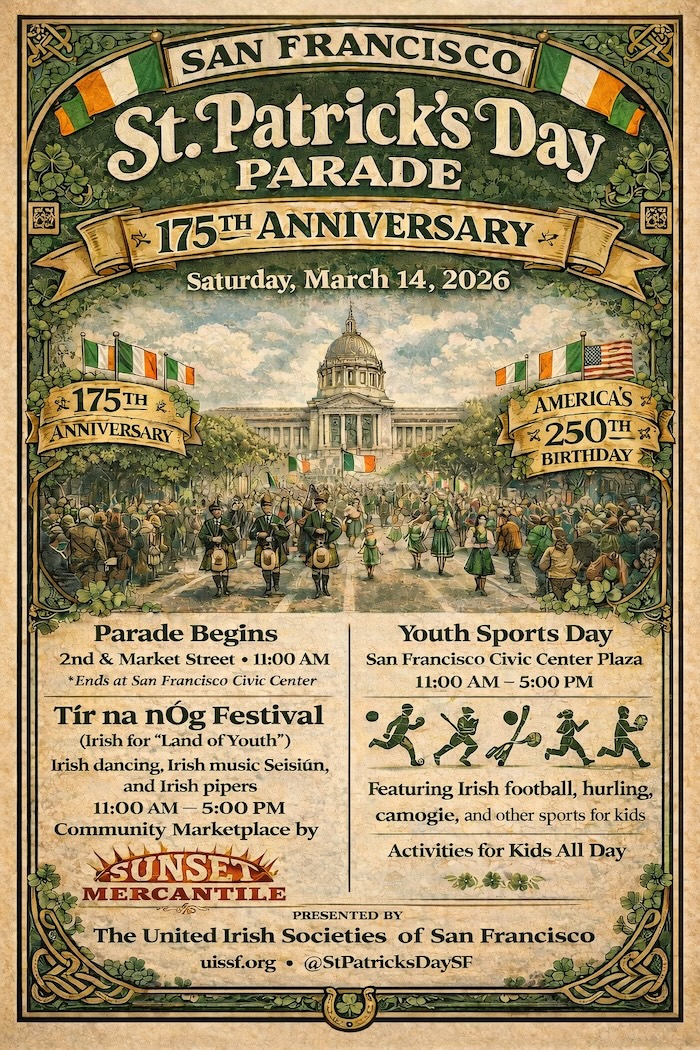 Kick off St Patrick’s season with a look at Ireland’s cinematic past! Join the Consulate General of Ireland and the San Francisco Film Preserve during on Tuesday March 12th at […] The 2026 San Francisco St. Patrick’s Day Parade, held on March 14th, celebrates the theme “Happy 250th America, You Are Great”. We will also be celebrating the 175th anniversary of […] Join us Sunday, March 15th for our 14th annual St. Patrick's Day Massacre charity bike ride. All money raised goes directly to UNICEF's children in Gaza, UNICEF's children in Ukraine, […] This St. Patrick’s Day, The Civic Kitchen invites food lovers, beer aficionados, and home cooks of all levels to an unforgettable culinary celebration: St. Patrick’s Supper (with Beer Pairings), an […] Join us for Irish-American art, music and more at this year’s Irish-American Crossroads Festival, running from March 28th- April 18th! More Information Events