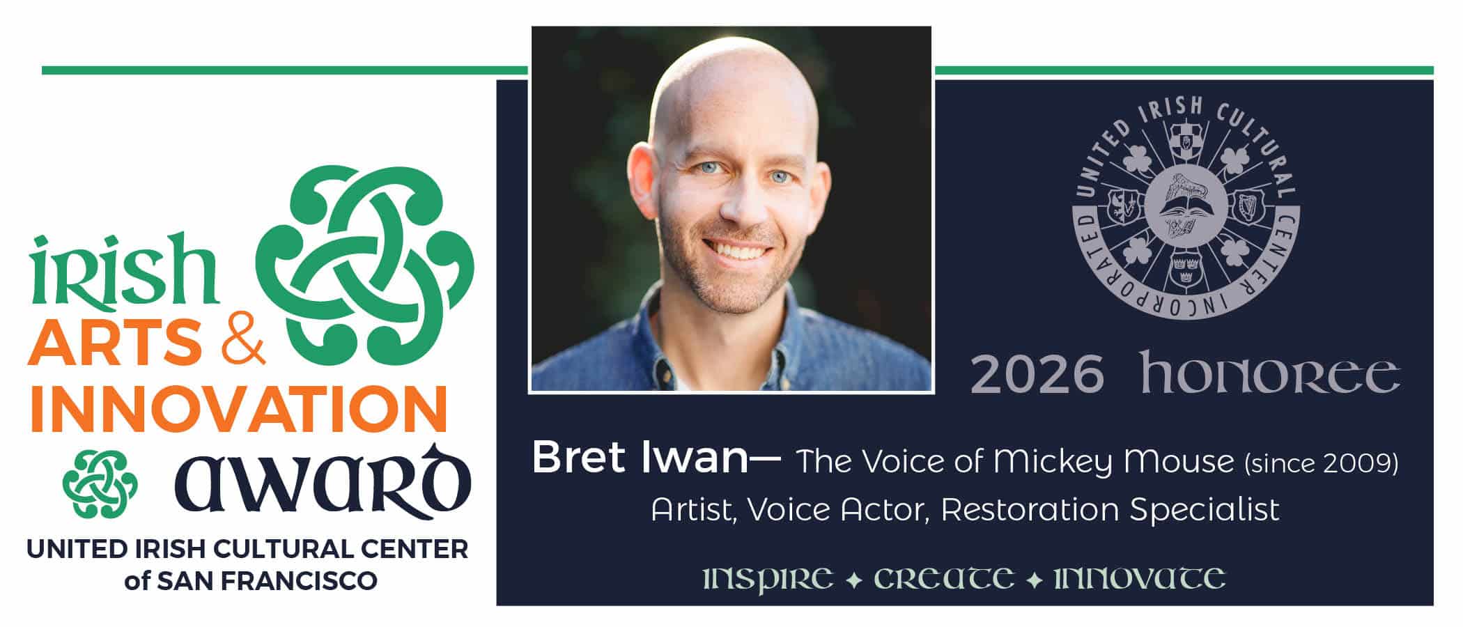 Established in 2025 to honor visionary contributions at the intersection of art, culture, and creativity, the Irish Arts and Innovation Award recognizes individuals whose work reflects the enduring spirit of Irish imagination and ingenuity. Presented annually by the United Irish Cultural Center of San Francisco, this award celebrates those who embody the resilience, artistry, and leadership rooted in our shared Irish heritage.